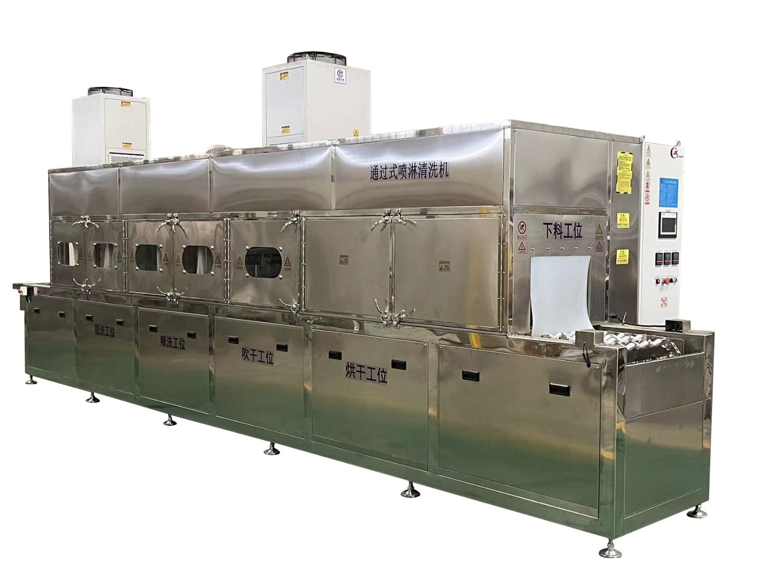 該設(shè)備有上下料網(wǎng)帶、噴淋清洗工位、噴淋漂洗工位、高壓風(fēng)切、熱風(fēng)烘干工位、溫控水加熱系統(tǒng)、風(fēng)機(jī)、溫控空氣加熱系統(tǒng)、PLC+觸摸屏控制系統(tǒng)、管路系統(tǒng)及智能電器控制系統(tǒng)等組成。自動進(jìn)排液和自動加溫系統(tǒng)完全實現(xiàn)了無人干預(yù),自動運行,很大程度上降低了工人的勞動強(qiáng)度。先進(jìn)的霧氣處理系統(tǒng)可以將清洗時產(chǎn)生的霧氣冷凝回流,空氣經(jīng)過濾和活性炭吸附后排出。